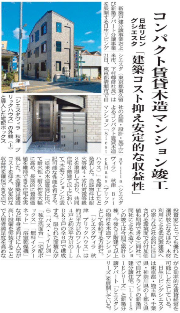 2025年10月28日発行「住宅産業新聞」に、日生リビングシエスタが企画・設計・施工を行う3階建て賃貸木造マンション 「SiestaVilla秋津BrickHaus」 が掲載されました。